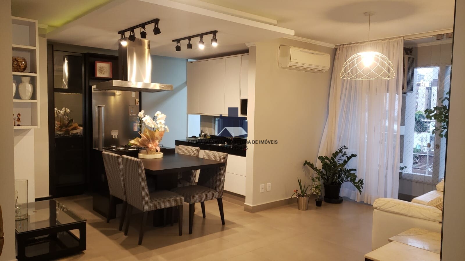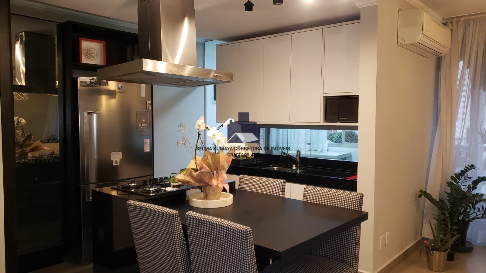 Cozinha planejada da marca Boa Vista Planejados, rico em armários, paneleiro, gaveteiro, cristaleira, mesa e 4 cadeiras confortavéis, Iluminação por régua com 04 spots pretos de cada lado, rebaixamento em gesso e iluminação indireta de Led, cuba de inox dupla Franke, sob pia em granito preto absoluto, com torneira alongada, aquecedor Lorenzetti, Air Fryier Philco, coifa de inox Elettromec