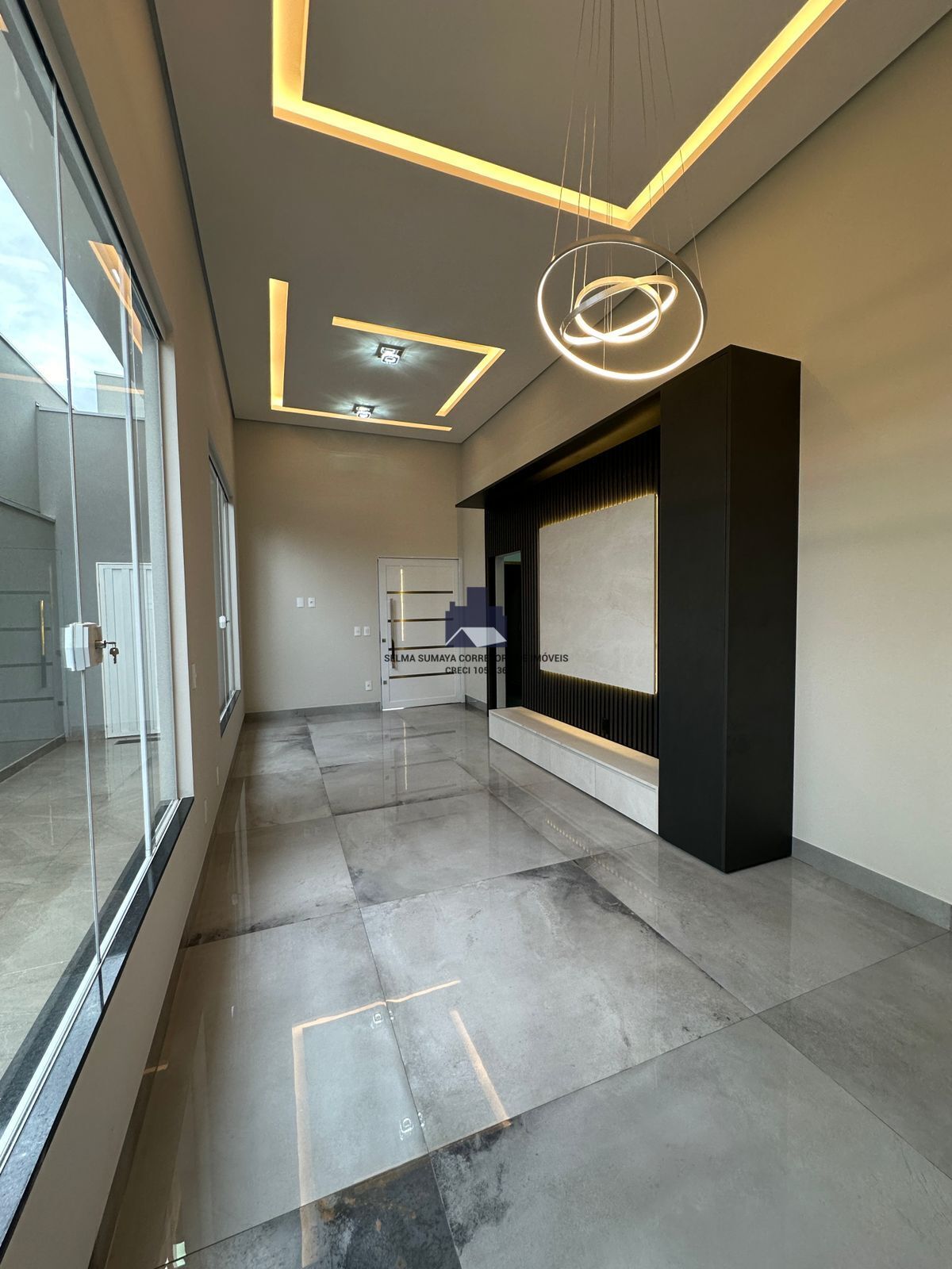 • Sala iluminada com rasgo de gesso com um maravilhoso lustre e um painel lindíssimo.