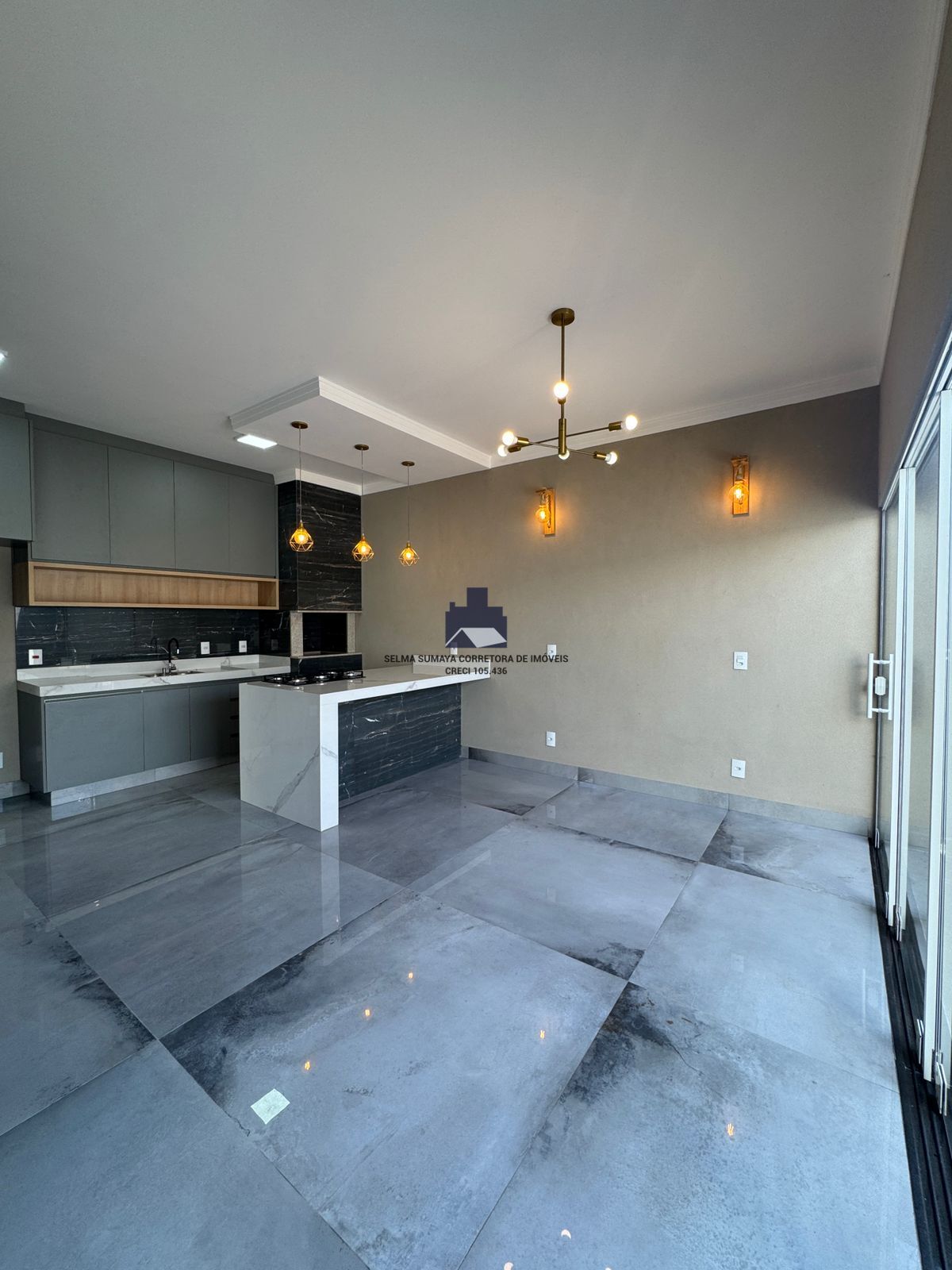 • Cozinha gourmet com armários, ilha esculpida em porcelanato (lastras ROCA), cooktop, sanca iluminada, lustre e churrasqueira.