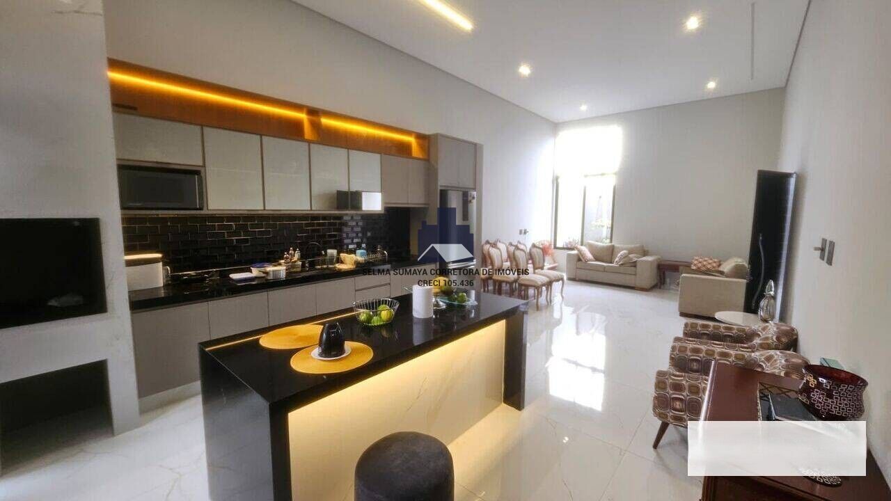 Sala ampla com pé direito alto integrado com a cozinha gourmet