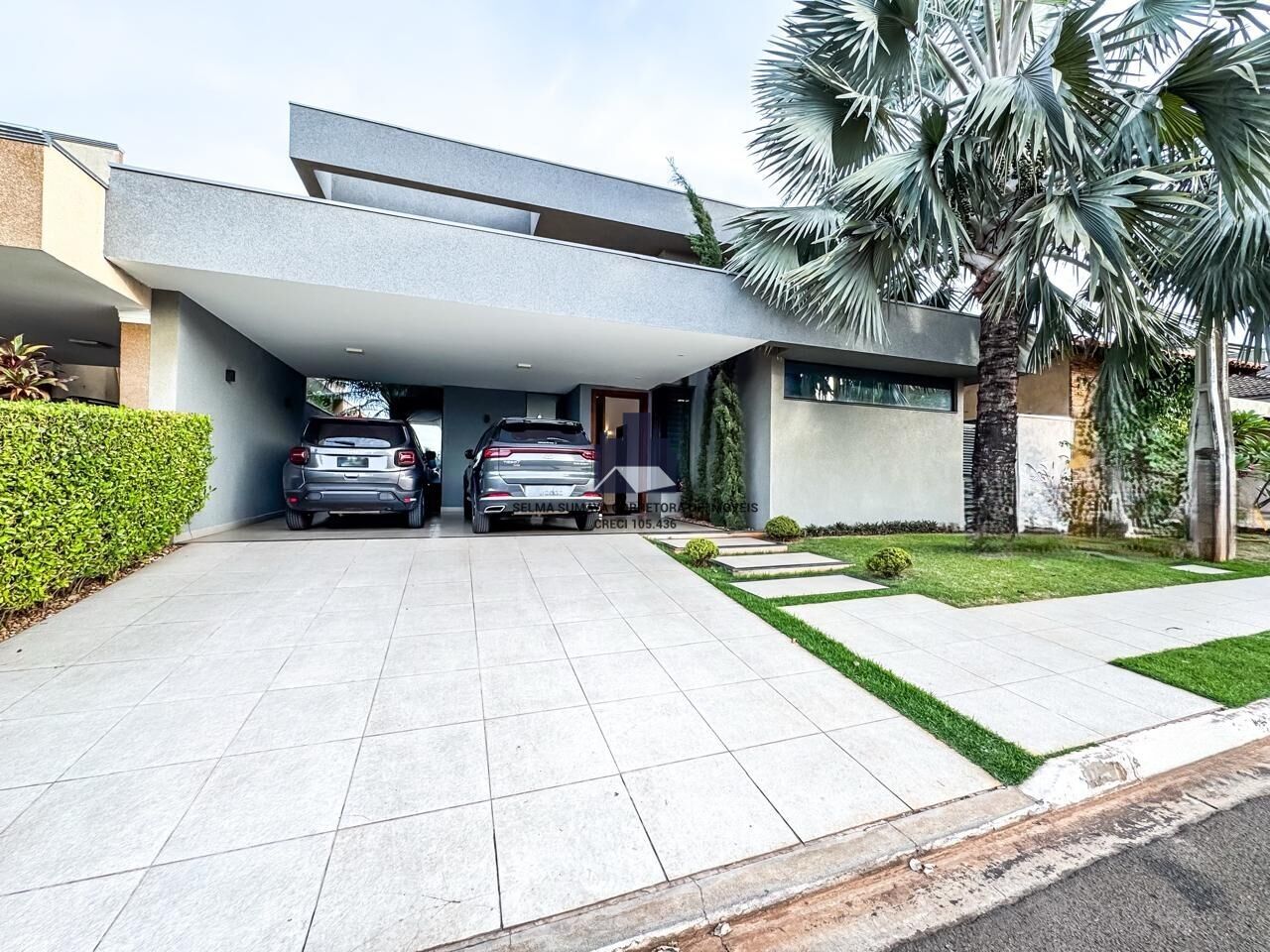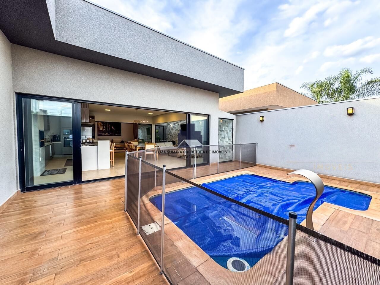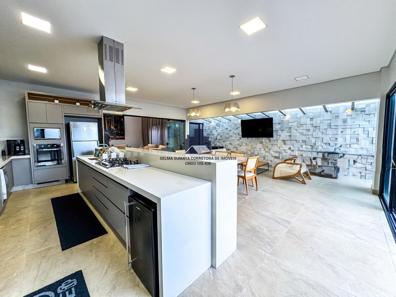 3 quartos (todos suítes), 5 banheiros, sala 2 ambientes, cozinha americana, área de serviço, área gourmet com churrasqueira e piscina e 4 vagas de garagem.