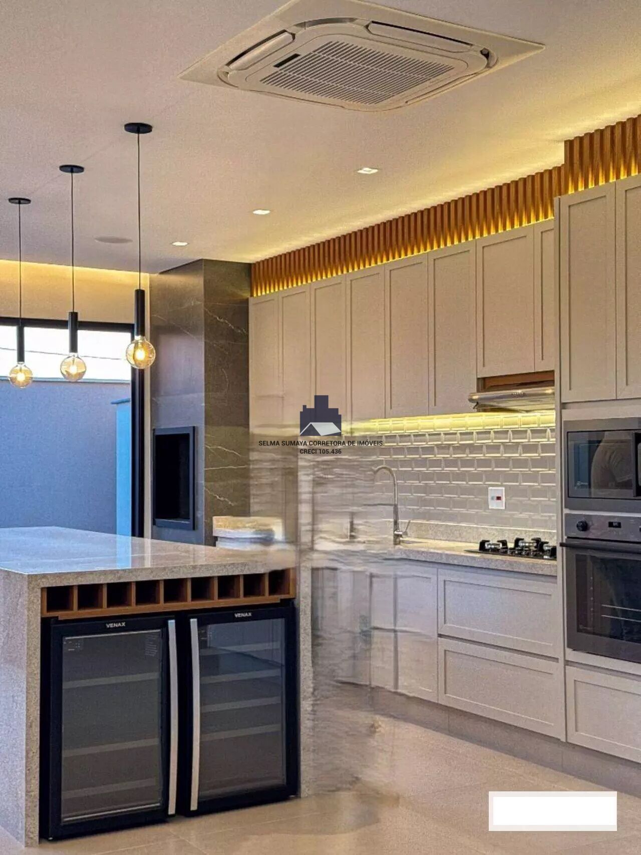 Espaço gourmet integrado com ilha, cervejeira, adega, cristaleira, churrasqueira, cooktop e coifa, forno, bebedouro, microondas, rico em marcenaria, som ambiente e automatizada com Alexa.
