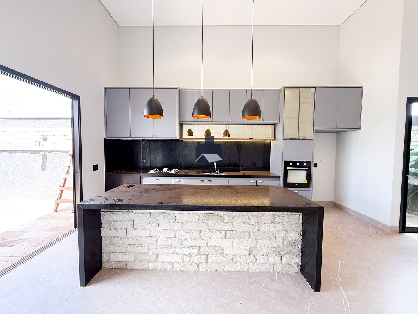 Cozinha gourmet, com coifa, cooktop e forno elétrico