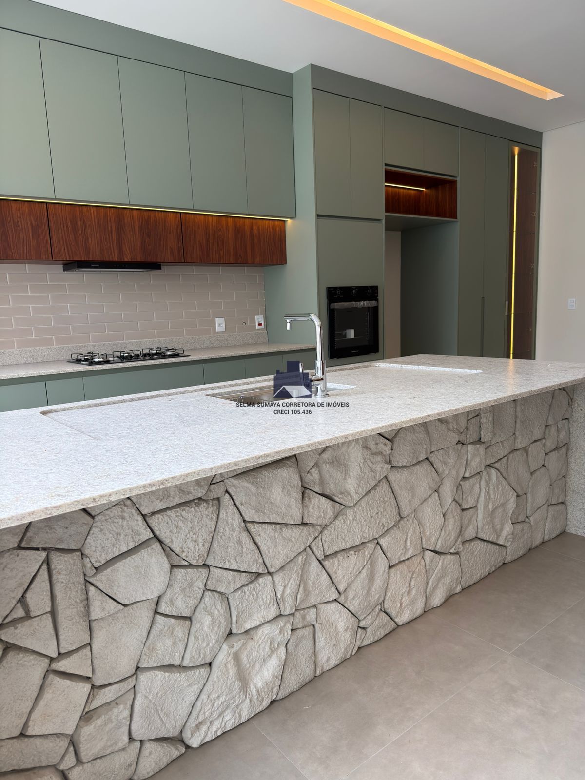 Cozinha com forno elétrico, cooktop a gás, churrasqueira a carvão