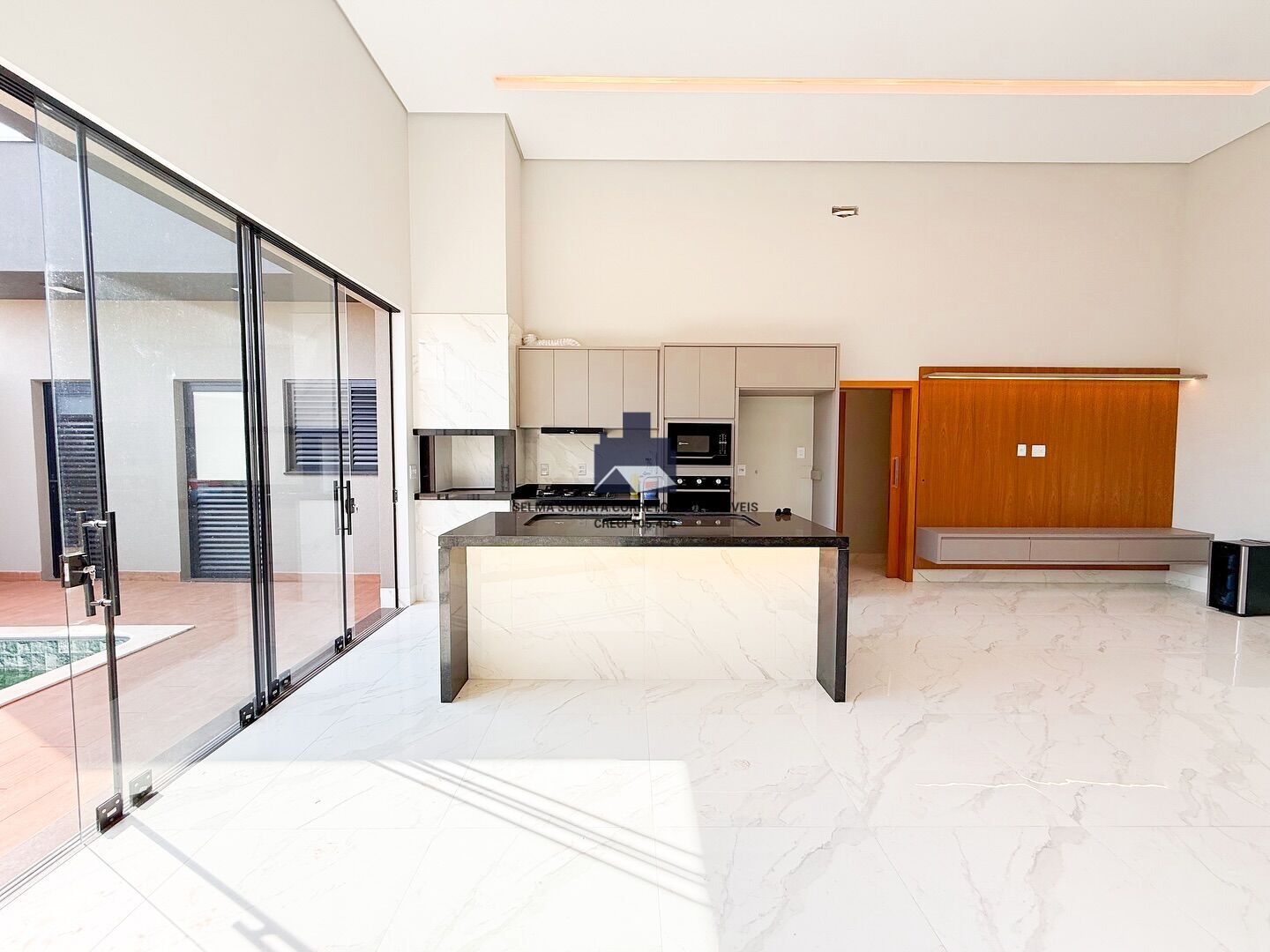 O imóvel possui 3 suítes, lavabo, escritório, sala ampla para dois ambientes, lavabo, cozinha planejada, área de serviço, varanda gourmet com churrasqueira e piscina.