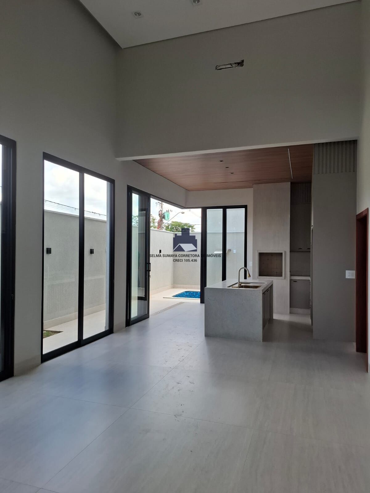 SALA PÉ DIREITO ALTO COM PAINEL EM MADEIRA