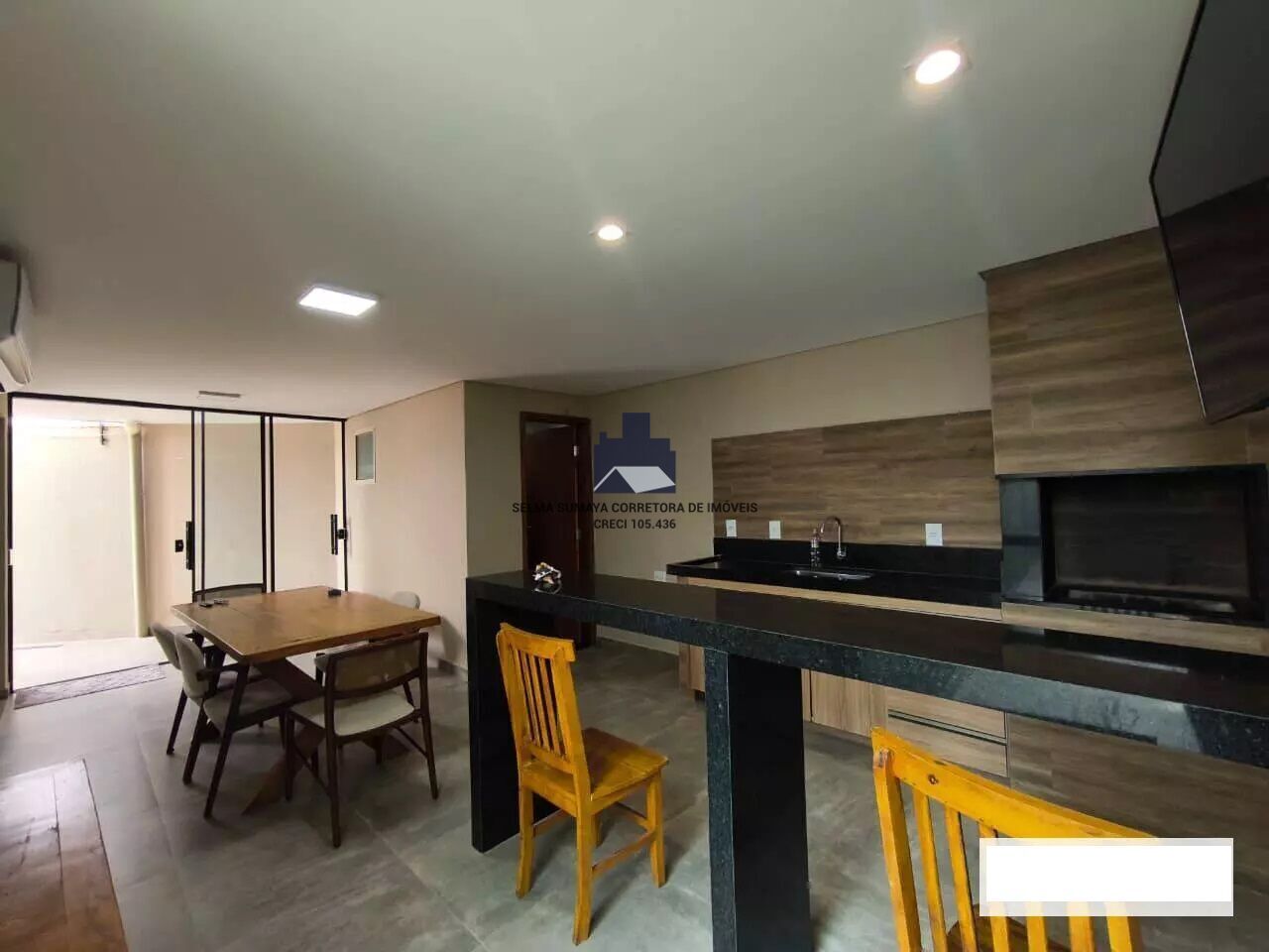 A área gourmet com balcão e churrasqueira e banheiro completo.