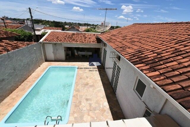 Possui 4 quartos tipo apartamento (um possui closet), todos os quartos com armário, dois quartos ficam no piso térreo da casa, e dois quartos na parte superior; possui 4 salas; varanda com piscina e churrasqueira; possui 6 banheiros; possui área de serviço (que é bem grande); possui um quarto de dispensa na parte de fora da casa.
